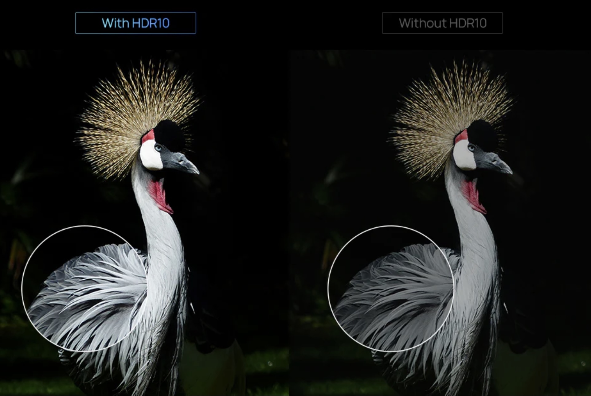 The Horizon Pro supports HDR10 (High Dynamic Range) content, which enhances the contrast and color range of the images. With HDR10, dark scenes reveal more detail, and bright scenes avoid looking washed out. This means you'll see nuances in shadows and highlights that standard dynamic range can't reproduce. It's especially noticeable in movies with high-contrast visuals, adding depth and realism to your viewing experience.